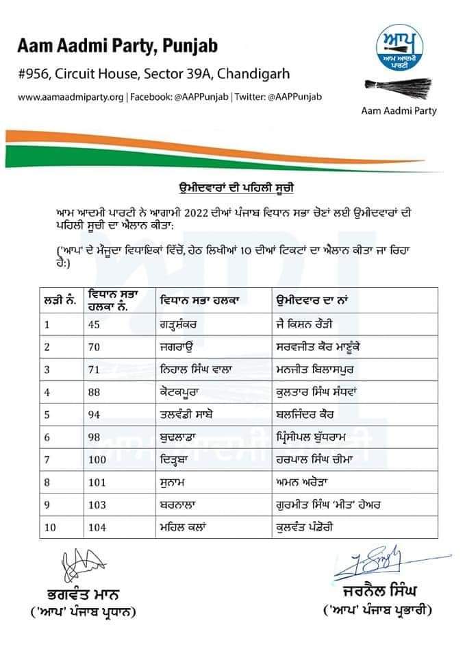 ਮਾਨਸਾ 12 ਨਵੰਬਰ : ਆਮ ਆਦਮੀ ਪਾਰਟੀ ਵੱਲੋਂ ਪੰਜਾਬ ਵਿਧਾਨ ਸਭਾ ਚੋਣਾਂ ਲਈ ਅੱਜ ਆਪਣੇ 10 ਉਮੀਦਵਾਰਾਂ ਦੀ ਪਹਿਲੀ ਸੂਚੀ ਜਾਰੀ ਕਰ ਦਿੱਤੀ। ਇਸ ਸੂਚੀ ਅਨੁਸਾਰ ਬੁਢਲਾਡਾ ਤੋਂ ਪ੍ਰਿੰਸੀਪਲ ਬੂੱਧ ਰਾਮ, ਤਲਵੰਡੀ ਸਾਬੋ ਤੋਂ ਬਲਜਿੰਦਰ ਕੌਰ, ਸੁਨਾਮ ਤੋਂ ਅਮਨ ਅਰੋੜਾ, ਕੋਟਕਪੂਰਾ ਤੋਂ ਕੁਲਤਾਰ ਸਿੰਘ ਸੰਧਵਾਂ, ਦਿੜ੍ਹਬਾ ਤੋਂ ਹਰਪਾਲ ਸਿੰਘ ਚੀਮਾ, ਬਰਨਾਲਾ ਤੋਂ ਗੁਰਮੀਤ ਸਿੰਘ ਮੀਤ ਹੇਅਰ, ਗੜ੍ਹਸ਼ੰਕਰ ਤੋਂ ਜੈ ਕ੍ਰਿਸ਼ਨ ਰੋੜੀ, ਜਗਰਾਉਂ ਤੋਂ ਸਰਬਜੀਤ ਕੌਰ ਮਾਣੂੰਕੇ, ਨਿਹਾਲ ਸਿੰਘ ਵਾਲਾ ਤੋਂ ਮਨਜੀਤ ਬਿਲਾਸਪੁਰ, ਮਹਿਲ ਕਲਾਂ ਤੋਂ ਕੁਲਵੰਤ ਪੰਡੌਰੀ ਨੂੰ ਉਮੀਦਵਾਰ ਐਲਾਨਿਆ ਗਿਆ ਹੈ। ਇਹ ਸਾਰੇ ਪਾਰਟੀ ਦੇ ਮੌਜੂਦਾ ਵਿਧਾਇਕ ਹਨ।