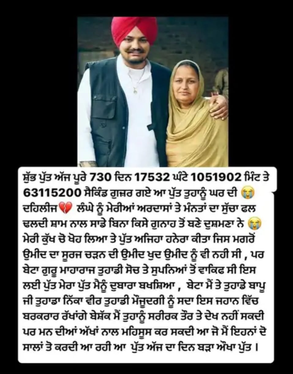 ਮਾਨਸਾ, 29 ਮਈ- ਸਿੱਧੂ ਮੂਸੇੇਵਾਲਾ ਦੀ ਮਾਤਾ ਚਰਨ ਕੌਰ ਵੱਲੋਂ ਆਪਣੇ ਪੁੱਤਰ ਨੂੰ ਅੱਜ 29 ਮਈ ਨੂੰ ਯਾਦ ਕਰਦਿਆਂ ਭਾਵੁਕ ਪੋਸਟ ਸ਼ੇਅਰ ਕੀਤੀ ਗਈ ਹੈ। ਇਸ ਪੋਸਟ ਨੇ ਹਰ ਕਿਸੇ ਦੀਆਂ ਅੱਖਾਂ ਨਮ ਕਰ ਦਿੱਤੀਆਂ ਹਨ। ਮਾਤਾ ਚਰਨ ਕੌਰ ਨੇ ਆਪਣੇ ਸੋਸ਼ਲ ਮੀਡੀਆ ਹੈਂਡਲ ਉੱਪਰ ਸਿੱਧੂ ਨਾਲ ਤਸਵੀਰ ਸ਼ੇਅਰ ਕਰਦਿਆਂ ਕੈਪਸ਼ਨ ਵਿੱਚ ਲਿਖਿਆ, ‘ਸ਼ੁੱਭ ਪੁੱਤ ਅੱਜ ਪੂਰੇ 730 ਦਿਨ 17532 ਘੰਟੇ 1051902 ਮਿੰਟ ਤੇ 63115200 ਸੈਕਿੰਡ ਗੁਜ਼ਰ ਗਏ ਆ… ਪੁੱਤ ਤੁਹਾਨੂੰ ਘਰ ਦੀ ਦਹਿਲੀਜ਼ ਲੰਘੇ ਨੂੰ, ਮੇਰੀਆਂ ਅਰਦਾਸਾਂ ਤੇ ਮੰਨਤਾਂ ਦਾ ਸੁੱਚਾ ਫਲ ਢਲਦੀ ਸ਼ਾਮ ਨਾਲ ਸਾਡੇ ਬਿਨਾ ਕਿਸੇ ਗੁਨਾਹ ਤੋਂ ਬਣੇ ਦੁਸ਼ਮਣਾ ਨੇ ਮੇਰੀ ਕੁੱਖ ਚੋ ਖੋਹ ਲਿਆ ਤੇ ਪੁੱਤ ਅਜਿਹਾ ਹਨੇਰਾ ਕੀਤਾ, ਜਿਸ ਮਗਰੋਂ ਉਮੀਦ ਦਾ ਸੂਰਜ ਚੜਨ ਦੀ ਉਮੀਦ ਖੁਦ ਉਮੀਦ ਨੂੰ ਵੀ ਨਹੀ ਸੀ ਪਰ ਬੇਟਾ ਗੁਰੂ ਮਾਹਾਰਾਜ ਤੁਹਾਡੀ ਸੋਚ ਤੇ ਸੁਪਨਿਆਂ ਤੋਂ ਵਾਕਿਫ ਸੀ। ਇਸ ਲਈ ਪੁੱਤ ਮੇਰਾ ਪੁੱਤ ਮੈਨੂੰ ਦੁਬਾਰਾ ਬਖਸ਼ਿਆ, ਬੇਟਾ ਮੈਂ ਤੇ ਤੁਹਾਡੇ ਬਾਪੂ ਜੀ ਤੁਹਾਡਾ ਨਿੱਕਾ ਵੀਰ ਤੁਹਾਡੀ ਮੌਜੂਦਗੀ ਨੂੰ ਸਦਾ ਇਸ ਜਹਾਨ ਵਿੱਚ ਬਰਕਰਾਰ ਰੱਖਾਂਗੇ, ਬੇਸ਼ੱਕ ਮੈਂ ਤੁਹਾਨੂੰ ਸਰੀਰਕ ਤੌਰ ’ਤੇ ਦੇਖ ਨਹੀਂ ਸਕਦੀ ਪਰ ਮਨ ਦੀਆਂ ਅੱਖਾਂ ਨਾਲ ਮਹਿਸੂਸ ਕਰ ਸਕਦੀ ਆ, ਜੋ ਮੈਂ ਇਨ੍ਹਾਂ ਦੋ ਸਾਲਾਂ ਤੋਂ ਕਰਦੀ ਆ ਰਹੀ ਆ ਪੁੱਤ ਅੱਜ ਦਾ ਦਿਨ ਬੜਾ ਔਖਾ ਪੁੱਤ।