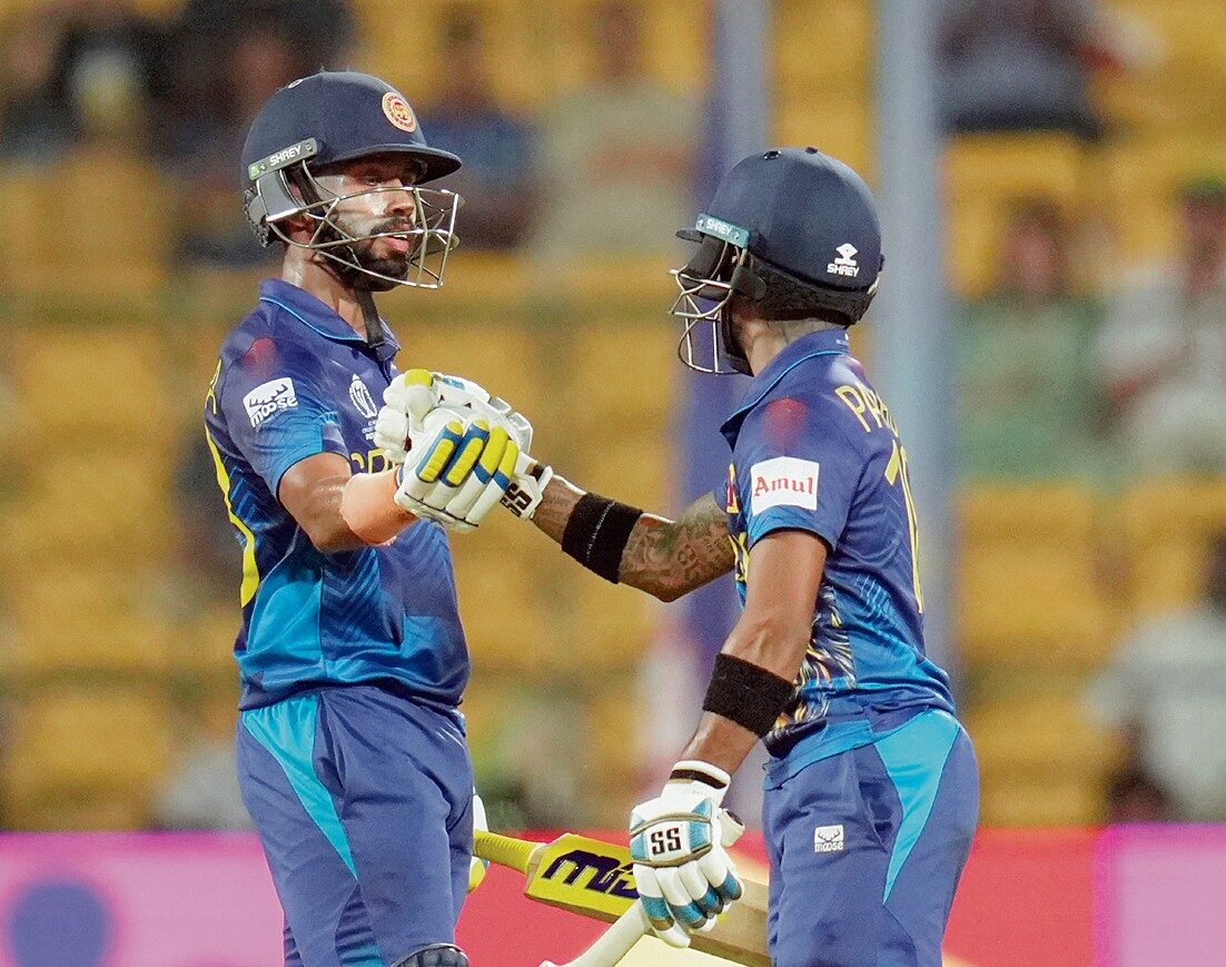 ਬੰਗਲੂਰੂ, 27 ਅਕਤੂਬਰ- ਇੰਗਲੈਂਡ ਨੂੰ ਸਸਤੇ ’ਚ ਸਮੇਟਣ ਤੋਂ ਬਾਅਦ ਬਿਹਤਰੀਨ ਰੌਂਅ ਵਿਚ ਚੱਲ ਰਹੇ ਪਾਥੁਮ ਨਿਸਾਂਕਾ ਤੇ ਸਦੀਰਾ ਸਮਰਵਿਕਰਮਾ ਦੀ ਅਟੁੱਟ ਭਾਈਵਾਲੀ ਦੀ ਬਦੌਲਤ ਸ੍ਰੀਲੰਕਾ ਨੇ ਅੱਜ ਇੱਥੇ 146 ਗੇਂਦਾਂ ਬਾਕੀ ਰਹਿੰਦਿਆਂ 8 ਵਿਕਟਾਂ ਨਾਲ ਵੱਡੀ ਜਿੱਤ ਹਾਸਲ ਕਰ ਕੇ ਸਾਬਕਾ ਚੈਂਪੀਅਨ ਨੂੰ ਵਿਸ਼ਵ ਕੱਪ ’ਚੋਂ ਬਾਹਰ ਹੋਣ ਕੰਢੇ ਖੜ੍ਹਾ ਕਰ ਦਿੱਤਾ। ਸ੍ਰੀਲੰਕਾ ਦੀ ਇਹ ਵਿਸ਼ਵ ਕੱਪ ਵਿਚ ਇੰਗਲੈਂਡ ’ਤੇ ਲਗਾਤਾਰ ਪੰਜਵੀਂ ਜਿੱਤ ਹੈ। ਉਨ੍ਹਾਂ 2003 ਤੋਂ ਇੰਗਲੈਂਡ ਖਿਲਾਫ਼ ਕੋਈ ਮੈਚ ਨਹੀਂ ਹਾਰਿਆ। ਵਰਤਮਾਨ ਵਿਸ਼ਵ ਕੱਪ ਵਿਚ ਇੰਗਲੈਂਡ ਦੀ ਪੰਜ ਮੈਚਾਂ ਵਿਚ ਇਹ ਚੌਥੀ ਹਾਰ ਹੈ ਜਿਸ ਨਾਲ ਉਸ ਦੀ ਸੈਮੀਫਾਈਨਲ ਵਿਚ ਪਹੁੰਚਣ ਦੀ ਸੰਭਾਵਨਾ ਕਮਜ਼ੋਰ ਹੋ ਗਈ ਹੈ। ਸ੍ਰੀਲੰਕਾ ਨੇ ਪੰਜ ਮੈਚਾਂ ਵਿਚ ਦੂਜੀ ਜਿੱਤ ਹਾਸਲ ਕਰ ਕੇ ਪੰਜਵੇਂ ਸਥਾਨ ਉਤੇ ਪਹੁੰਚ ਕੇ ਆਪਣੀਆਂ ਉਮੀਦਾਂ ਨੂੰ ਕਾਇਮ ਰੱਖਿਆ ਹੈ। ਇੰਗਲੈਂਡ ਦੀ ਟੀਮ ਪਹਿਲਾਂ ਬੱਲੇਬਾਜ਼ੀ ਕਰਦਿਆਂ 33.2 ਓਵਰਾਂ ਵਿਚ 156 ਦੌੜਾਂ ਉਤੇ ਆਊਟ ਹੋ ਗਈ। ਸ੍ਰੀਲੰਕਾ ਨੇ 25.4 ਓਵਰਾਂ ਵਿਚ ਦੋ ਵਿਕਟਾਂ ਦੇ ਨੁਕਸਾਨ ਉਤੇ 160 ਦੌੜਾਂ ਬਣਾ ਕੇ ਮੈਚ ਨੂੰ ਇਕਪਾਸੜ ਬਣਾਉਣ ਵਿਚ ਕੋਈ ਕਸਰ ਬਾਕੀ ਨਹੀਂ ਛੱਡੀ। ਨਿਸਾਂਕਾ ਨੇ 83 ਗੇਂਦਾਂ ਵਿਚ ਸੱਤ ਚੌਕਿਆਂ ਤੇ ਦੋ ਛੱਕਿਆਂ ਦੀ ਮਦਦ ਨਾਲ ਨਾਬਾਦ 77 ਦੌੜਾਂ ਬਣਾਈਆਂ। ਸਮਰਵਿਕਰਮਾ ਨੇ 54 ਗੇਂਦਾਂ ’ਤੇ ਨਾਬਾਦ 65 ਦੌੜਾਂ ਦੀ ਪਾਰੀ ਖੇਡੀ ਜਿਸ ਵਿਚ ਸੱਤ ਚੌਕੇ ਤੇ ਇਕ ਛੱਕਾ ਸ਼ਾਮਲ ਸੀ। ਇਨ੍ਹਾਂ ਦੋਵਾਂ ਨੇ ਤੀਜੇ ਵਿਕਟ ਲਈ 137 ਦੌੜਾਂ ਦੀ ਭਾਈਵਾਲੀ ਕੀਤੀ।