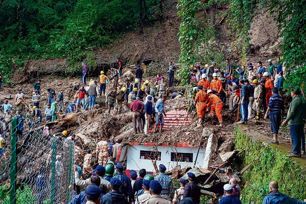 ਹਿਮਾਚਲ ਪ੍ਰਦੇਸ਼ ’ਚ ਭਾਰੀ ਮੀਂਹ ਦਾ ਕਹਿਰ ਅੱਜ ਵੀ ਜਾਰੀ ਹੈ ਅਤੇ ਮੀਂਹ ਕਾਰਨ ਵਾਪਰੀਆਂ ਘਟਨਾਵਾਂ ਵਿੱਚ ਘੱਟੋ-ਘੱਟ 51 ਜਣਿਆਂ ਦੀ ਮੌਤ ਹੋ ਚੁੱਕੀ ਹੈ ਜਿਨ੍ਹਾਂ ’ਚੋਂ 14 ਵਿਅਕਤੀ ਸ਼ਿਮਲਾ ਨਾਲ ਸਬੰਧਤ ਹਨ। ਸੋਲਨ ਤੇ ਮੰਡੀ ਜ਼ਿਲ੍ਹੇ ’ਚ ਦੋ ਪਰਿਵਾਰਾਂ ਦੇ ਸੱਤ-ਸੱਤ ਜੀਅ ਹਲਾਕ ਹੋ ਗਏ ਹਨ। ਅਧਿਕਾਰੀਆਂ ਨੇ ਅੱਜ ਇਹ ਜਾਣਕਾਰੀ ਦਿੱਤੀ। ਮੌਸਮ ਵਿਭਾਗ ਨੇ ਸੂਬੇ ’ਚ ਭਲਕੇ 15 ਅਗਸਤ ਲਈ ਯੈਲੋ ਅਲਰਟ ਜਾਰੀ ਕਰਦਿਆਂ 18 ਅਗਸਤ ਤੱਕ ਮੀਂਹ ਦੀ ਪੇਸ਼ੀਨਗੋਈ ਕੀਤੀ ਹੈ।ਸ਼ਿਮਲਾ ਦੇ ਸਮਰ ਹਿੱਲ ਇਲਾਕੇ ’ਚ ਸ਼ਿਵ ਮੰਦਿਰ ਦੇ ਮਲਬੇ ਹੇਠ ਦਬਣ ਕਾਰਨ ਨੌਂ ਵਿਅਕਤੀਆਂ ਦੀ ਮੌਤ ਹੋਈ ਹੈ ਅਤੇ ਕਈ ਲੋਕਾਂ ਦੇ ਮਲਬੇ ਹੇਠ ਦੱਬੇ ਹੋਣ ਦਾ ਖਦਸ਼ਾ ਹੈ। ਸਾਉਣ ਦਾ ਮਹੀਨਾ ਹੋਣ ਕਾਰਨ ਹਾਦਸੇ ਸਮੇਂ ਮੰਦਰ ’ਚ ਵੱਡੀ ਗਿਣਤੀ ’ਚ ਸ਼ਰਧਾਲੂ ਮੌਜੂਦ ਸਨ। ਸੂਬੇ ਦੀ ਰਾਜਧਾਨੀ ’ਚ ਢਿੱਗਾਂ ਖਿਸਕਣ ਦੀਆਂ ਦੋ ਘਟਨਾਵਾਂ ਵਾਪਰੀਆਂ ਹਨ। ਮੁੱਖ ਮੰਤਰੀ ਸੁਖਵਿੰਦਰ ਸਿੰਘ ਸੁੱਖੂ ਨੇ ਮੌਕੇ ਦਾ ਦੌਰਾ ਕਰਦਿਆਂ ਦੱਸਿਆ ਕਿ ਸਮਰ ਹਿੱਲ ਇਲਾਕੇ ’ਚ ਇੱਕ ਸ਼ਿਵ ਮੰਦਰ ਤੇ ਫਾਗਲੀ ਇਲਾਕੇ ’ਚ ਇੱਕ ਹੋਰ ਥਾਂ ’ਤੇ ਢਿੱਗਾਂ ਖਿਸਕੀਆਂ ਹਨ ਅਤੇ ਹੁਣ ਤੱਕ ਮਲਬੇ ਹੇਠੋਂ ਨੌਂ ਲਾਸ਼ਾਂ ਬਾਹਰ ਕੱਢੀਆਂ ਗਈਆਂ ਹਨ। ਫਾਗਲੀ ਇਲਾਕੇ ’ਚ ਕਈ ਮਕਾਨ ਮਿੱਟੀ ’ਚ ਧਸ ਗਏ ਹਨ ਅਤੇ ਇੱਥੇ ਪੰਜ ਲਾਸ਼ਾਂ ਬਰਾਮਦ ਕੀਤੀਆਂ ਜਾ ਚੁੱਕੀਆਂ ਹਨ ਤੇ 17 ਲੋਕਾਂ ਨੂੰ ਬਚਾਇਆ ਗਿਆ ਹੈ। ਭਾਰੀ ਮੀਂਹ ਕਾਰਨ ਸਾਰੇ ਸਕੂਲ ਤੇ ਕਾਲਜ ਬੰਦ ਰੱਖਣ ਦੇ ਹੁਕਮ ਦਿੱਤੇ ਗਏ ਹਨ।