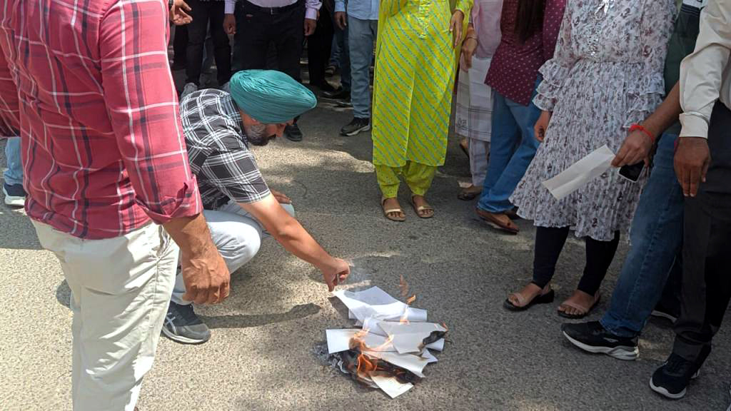 ਪਟਿਆਲਾ, 4 ਸਤੰਬਰ (ਪ. ਪ.)- ਪੰਜਾਬ ਸਟੇਟ ਮਨਿਸਟੀਰੀਅਲ ਸਰਵਿਸਿਜ਼ ਯੂਨੀਅਨ (ਪੀ. ਐਸ. ਐਮ. ਐਸ. ਯੂ.) ਦੀ ਸੂਬਾ ਬਾਡੀ ਪੰਜਾਬ ਵੱਲੋਂ ਉਲੀਕੇ ਗਏ ਐਕਸ਼ਨ ਦੇ ਤਹਿਤ ਅੱਜ ਪੂਰੇ ਪੰਜਾਬ ਵਿਚ ਥਾਂ ਥਾਂ ’ਤੇ ਪੰਜਾਬ ਸਰਕਾਰ ਵਲੋਂ ਲਗਾਏ ਗਏ ‘ਐਸਮਾ’ ਕਾਨੂੰਨ ਦਾ ਜ਼ਬਰਦਸਤ ਵਿਰੋਧ ਕੀਤਾ ਗਿਆ। ਇਸੇ ਤਰ੍ਹਾਂ ਹੀ ਜ਼ਿਲ੍ਹਾ ਪਟਿਆਲਾ ਵਿਖੇ ਸੂਬਾ ਸੀਨੀਅਰ ਮੀਤ ਪ੍ਰਧਾਨ ਸ. ਗੁਰਮੇਲ ਸਿੰਘ ਵਿਰਕ ਦੀ ਅਗਵਾਈ ਵਿੱਚ ਜਿਲ੍ਹਾ ਪਟਿਆਲਾ ਦੇ ਮਨਿਸਟਰੀਅਲ ਮੁਲਾਜ਼ਮਾਂ ਵੱਲੋਂ ਦਫ਼ਤਰ ਡਿਪਟੀ ਕਮਿਸ਼ਨਰ ਪਟਿਆਲਾ ਵਿਖੇ ‘ਐਸਮਾ’ ਕਨੂੰਨ ਦੀਆ ਕਾਪੀਆਂ ਸਾੜੀਆਂ ਗਈਆਂ। ਇਸ ਮੌਕੇ ਬੋਲਦਿਆਂ ਸੂਬਾ ਸੀਨੀਅਰ ਮੀਤ ਪ੍ਰਧਾਨ ਗੁਰਮੇਲ ਸਿੰਘ ਵਿਰਕ ਜ਼ਿਲ੍ਹਾ ਵਿੱਤ ਸਕੱਤਰ, ਗੁਰਪ੍ਰੀਤ ਸਿੰਘ ਪਨੇਸਰ ਵਲੋਂ ਦੱਸਿਆ ਗਿਆ ਕਿ ਪੰਜਾਬ ਸਰਕਾਰ ਵੱਲੋਂ ਮੁਲਾਜ਼ਮਾਂ ਦੇ ਜਾਇਜ਼ ਸੰਘਰਸ਼ਾਂ ਨੂੰ ਰੋਕਣ ਲਈ ਪੰਜਾਬ ਵਿੱਚ ਐਸਮਾ ਕਾਨੂੰਨ ਲਾਗੂ ਕੀਤਾ ਗਿਆ ਹੈ, ਜਿਸ ਕਾਰਨ ਸਮੁੱਚੇ ਮੁਲਾਜ਼ਮਾਂ, ਮੁਲਾਜ਼ਮ ਜਥੇਬੰਦੀਆਂ ਅਤੇ ਭਰਾਤਰੀ ਜਥੇਬੰਦੀਆਂ ਵਿਚ ਪੰਜਾਬ ਸਰਕਾਰ ਦੇ ਖਿਲਾਫ ਭਾਰੀ ਰੋਸ ਪਾਇਆਂ ਜਾ ਰਿਹਾ ਹੈ। ਉਨ੍ਹਾਂ ਕਿਹਾ ਕਿ ਐਸਮਾ ਨੋਟੀਫਿਕੇਸ਼ਨ ਦੀਆਂ ਕਾਪੀਆਂ ਅੱਜ ਸਮੁੱਚੇ ਪੰਜਾਬ ਵਿੱਚ ਜ਼ਿਲ੍ਹਾ ਹੈਡ ਕੁਆਟਰਾਂ ਤੇ ਸਾੜੀਆਂ ਜਾ ਰਹੀਆ ਹਨ। ਗੁਰਮੇਲ ਵਿਰਕ ਨੇ ਕਿਹਾ ਕਿ ਸਰਕਾਰ ਦੀ ਜਿੱਤ ਵਿਚ ਸਰਕਾਰੀ ਮੁਲਾਜ਼ਮਾਂ ਦਾ ਵੱਡਾ ਯੋਗਦਾਨ ਹੈ। ਸਰਕਾਰੀ ਮੁਲਾਜ਼ਮਾਂ ਮੁਲਾਜ਼ਮਾਂ ਦੇ ਝੁਕਾਅ ਕਾਰਨ ਹੀ ਪੰਜਾਬ ਵਿਚ ‘ਆਪ’ ਦੀ ਹਵਾ ਚੱਲੀ ਸੀ।