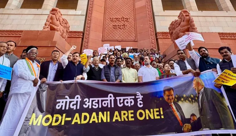 ਨਵੀਂ ਦਿੱਲੀ, 3 ਦਸੰਬਰ- ਲੋਕ ਸਭਾ ਐਲਓਪੀ ਰਾਹੁਲ ਗਾਂਧੀ, ਕਾਂਗਰਸ ਸੰਸਦ ਮੈਂਬਰ ਪ੍ਰਿਅੰਕਾ ਗਾਂਧੀ ਵਾਡਰਾ ਅਤੇ ਭਾਰਤ ਬਲਾਕ ਦੇ ਹੋਰ ਨੇਤਾਵਾਂ ਨੇ ਮੰਗਲਵਾਰ ਨੂੰ ਅਡਾਨੀ ’ਤੇ ਲਗਾਏ ਦੋਸ਼ਾਂ ਦੇ ਮੁੱਦੇ ‘ਤੇ ਸੰਸਦ ਅੱਗੇ ਪ੍ਰਦਰਸ਼ਨ ਕੀਤਾ। ਇਸ ਮੌਕੇ ਉਨ੍ਹਾਂ ਬੈਨਰਾਂ ਨਾਲ ਪਰਦਰਸ਼ਨ ਕਰਦਿਆਂ ਅਡਾਨੀ ਦੋਸ਼ਾਂ ਦੀ ਸਾਂਝੀ ਸੰਸਦੀ ਕਮੇਟੀ (ਜੇਪੀਸੀ) ਤੋਂ ਜਾਂਚ ਦੀ ਮੰਗ ਕਰਦੇ ਹੋਏ ਕਈ ਨਾਅਰੇ ਲਗਾਏ। ਲੋਕ ਸਭਾ ਵਿਚ ਵਿਰੋਧੀ ਧਿਰ ਦੇ ਆਗੂ ਰਾਹੁਲ ਗਾਂਧੀ ਨੇ ਸੋਸ਼ਲ ਮੀਡੀਆ ’ਤੇ ਪ੍ਰਦਰਸ਼ਨ ਦੀਆਂ ਤਸਵੀਰਾਂ ਸਾਂਝਾ ਕਰਦਿਆਂ ਕਿਹਾ, “ਅੱਜ ਸੰਸਦ ਕੰਪਲੈਕਸ, ਮਕਰ ਦੁਆਰ ਵਿਖੇ ਵਿਰੋਧ ਪ੍ਰਦਰਸ਼ਨ ਸਵਾਲ ਪੁੱਛ ਰਹੇ ਹਨ: ਅਡਾਨੀ ਦੇ ਅਰਬਾਂ ਨਾਲ ਕਿਸਨੂੰ ਫਾਇਦਾ ਹੋਵੇਗਾ, ਮੋਦੀ ਜੀ? ‘‘ਪ੍ਰਧਾਨ ਮੰਤਰੀ ਦੀ ਚੁੱਪ ਬਹੁਤ ਕੁਝ ਬੋਲਦੀ ਹੈ’’