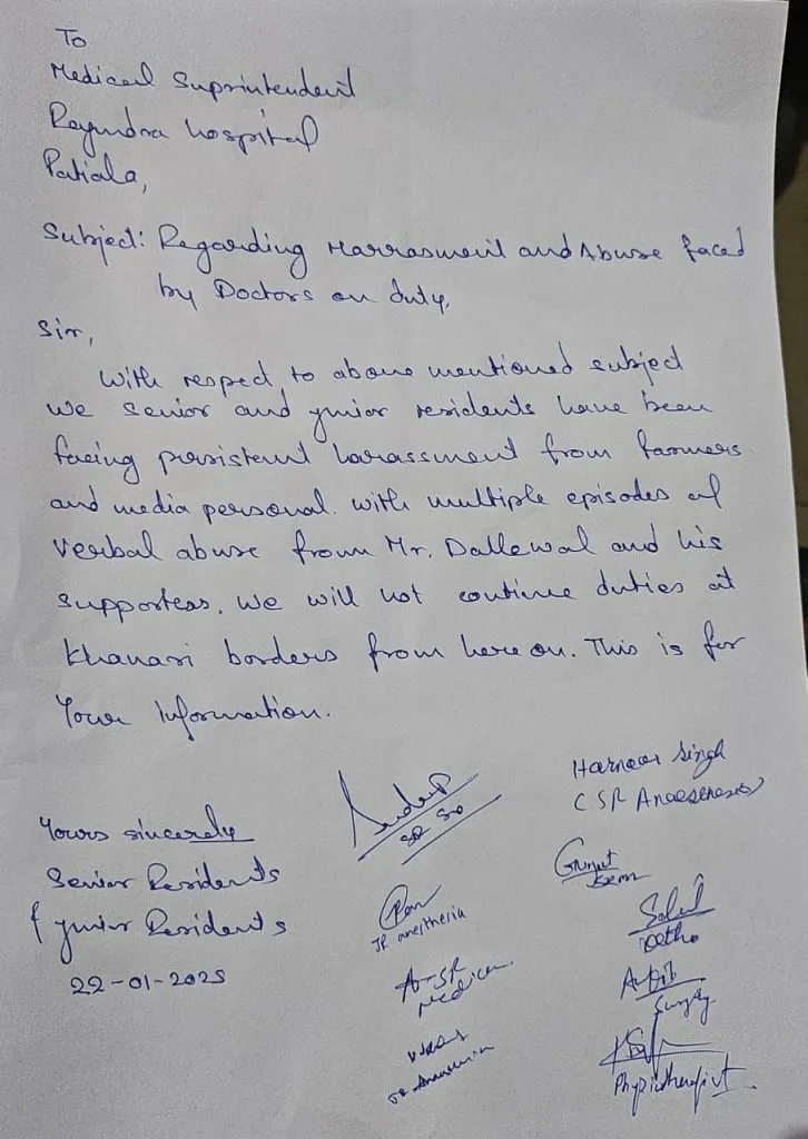ਪਾਤੜਾਂ, 22 ਜਨਵਰੀ- ਢਾਬੀ ਗੁੱਜਰਾਂ (ਖਨੌਰੀ) ਬਾਰਡਰ ’ਤੇ ਮਰਨ ਵਰਤ ਉੱਤੇ ਬੈਠੇ ਕਿਸਾਨ ਆਗੂ ਜਗਜੀਤ ਸਿੰਘ ਡੱਲੇਵਾਲ ਦਾ ਇਲਾਜ ਕਰਨ ਵਾਲੀ ਰਜਿੰਦਰਾ ਹਸਪਤਾਲ ਪਟਿਆਲਾ ਦੀ ਟੀਮ ਆਪਣੀ ਡਿਊਟੀ ਛੱਡ ਕੇ ਵਾਪਸ ਚਲੀ ਗਈ ਹੈ। ਕਿਸਾਨ ਆਗੂ ਦੇ ਇਲਾਜ ਵਿਚ ਲੱਗੀ ਡਾਕਟਰਾਂ ਦੀ ਟੀਮ ਨੇ ਇਲਾਜ ਕਰਨ ਤੋਂ ਨਾਂਹ ਕਰ ਦਿੱਤੀ ਹੈ। ਡਾਕਟਰਾਂ ਦੀ ਟੀਮ ਨੇ ਸਿਵਲ ਸਰਜਨ ਪਟਿਆਲਾ ਡਾ. ਦਵਿੰਦਰਪਾਲ ਸਿੰਘ ਨੂੰ ਲਿਖੇ ਪੱਤਰ ਵਿਚ ਕਿਸਾਨ ਆਗੂਆਂ ’ਤੇ ਕਥਿਤ ਬਦਸਲੂਕੀ ਕਰਨ ਦੇ ਦੋਸ਼ ਲਾਏ ਹਨ। ਹਾਲਾਂਕਿ ਕਿਸਾਨ ਆਗੂਆਂ ਨੇ ਡਾਕਟਰਾਂ ਦੇ ਇਸ ਦਾਅਵੇ ਨੂੰ ਸਿਰੇ ਤੋਂ ਖਾਰਜ ਕਰਦਿਆਂ ਕਿਹਾ ਕਿ ਜਗਜੀਤ ਸਿੰਘ ਡੱਲੇਵਾਲ ਤੇ ਉਨ੍ਹਾਂ ਦੇ ਕਿਸਾਨ ਆਗੂ ਬਹੁਤ ਹੀ ਸੁਲਝੇ ਹੋਏ ਹਨ ਤੇ ਇਲਾਜ ਕਰਨ ਵਾਲਾ ਡਾਕਟਰ ਰੱਬ ਦਾ ਰੂਪ ਹੁੰਦਾ ਹੈ।